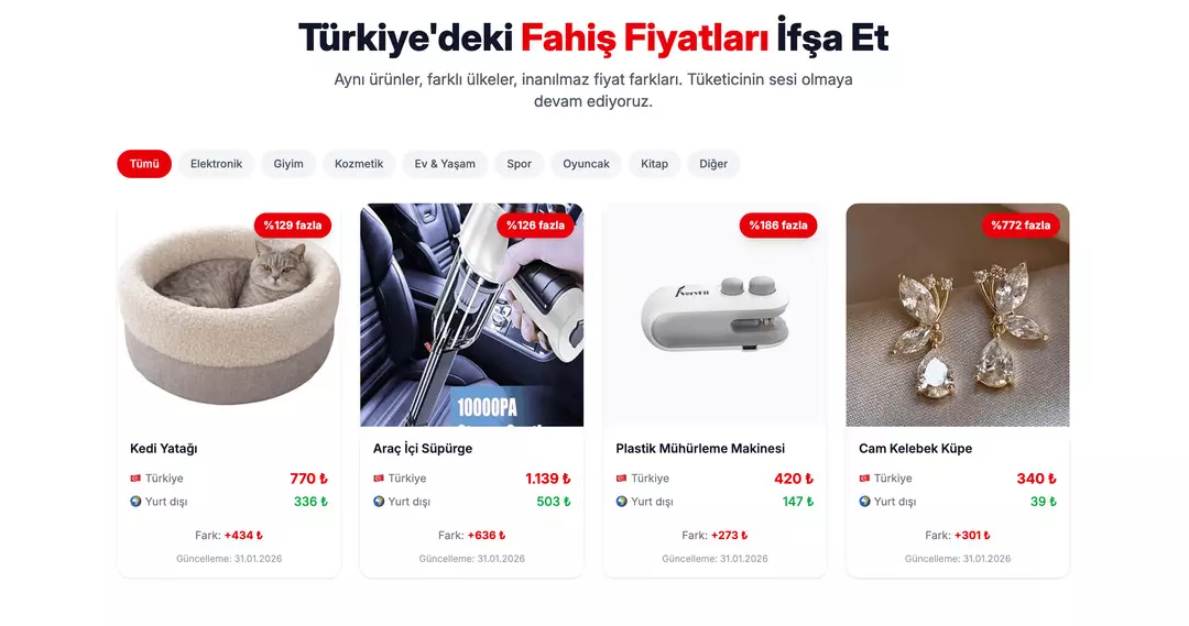Kullanıcı Bildirimi: Vatandaşlar, Türkiye’de fahiş fiyatla satıldığını düşündükleri ürünleri ve yurt dışı emsallerini sisteme yüklüyor.