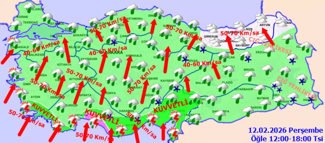 Yağışın yanı sıra rüzgar da etkisini artırıyor. Marmara’nın güneyi, Ege, Akdeniz, İç Anadolu ve Karadeniz’in iç kesimlerinde rüzgarın güneyli yönlerden fırtına şeklinde (40-80 km/saat) esmesi bekleniyor. Uzmanlar; çatı uçması, ağaç devrilmesi ve karbonmonoksit zehirlenmelerine karşı dikkatli olunması gerektiğini vurguladı.